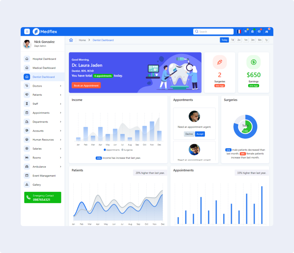 Medflex Bootstrap Medical Admin Dashboard is a web template designed specifically for healthcare professionals and organizations. Built with the Bootstrap framework, it provides a pre-built structure and common elements for crafting a user-friendly and responsive web interface for managing medical facilities. It comes with Hospital Dashboard, Medical Dashboard, Dentist Dashboard, Doctors, Patients, Staff, Appointments, Departments, Accounts, Human Resources, Salaries, Rooms, Ambulance and etc...
