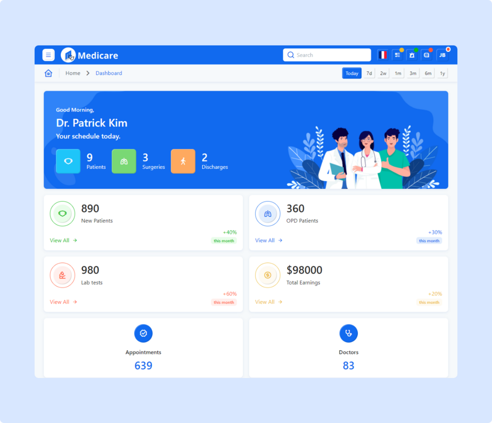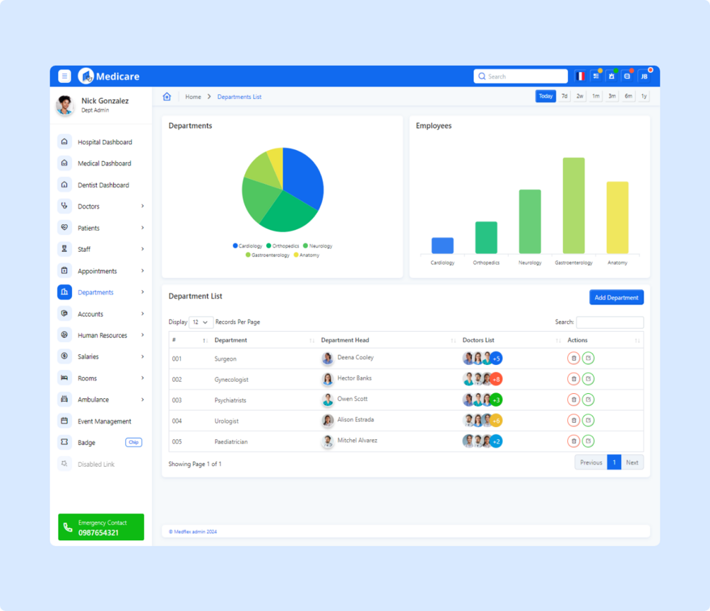 Medicare Bootstrap Medical Admin Dashboard is a web template designed specifically for healthcare professionals and organizations. Built with the Bootstrap framework, it provides a pre-built structure and common elements for crafting a user-friendly and responsive web interface for managing medical facilities. It comes with Hospital Dashboard, Medical Dashboard, Dentist Dashboard, Doctors, Patients, Staff, Appointments, Departments, Accounts, Human Resources, Salaries, Rooms, Ambulance and etc...